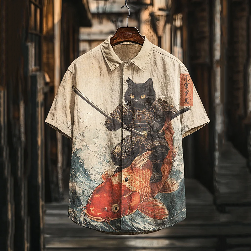 Men's Black Cat Warrior Riding Koi Art Casual Short Sleeve Shirts