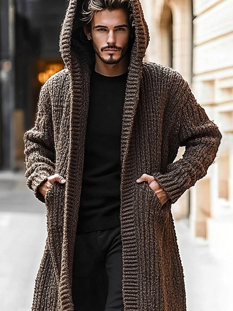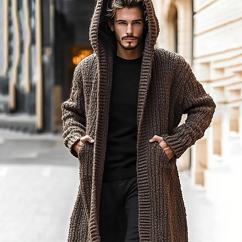 Men'S Knitted Hooded Long Sweater Cardigan