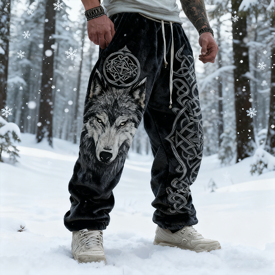 Men's Retro Viking Style Wolf Head Print Flannel Long Pants