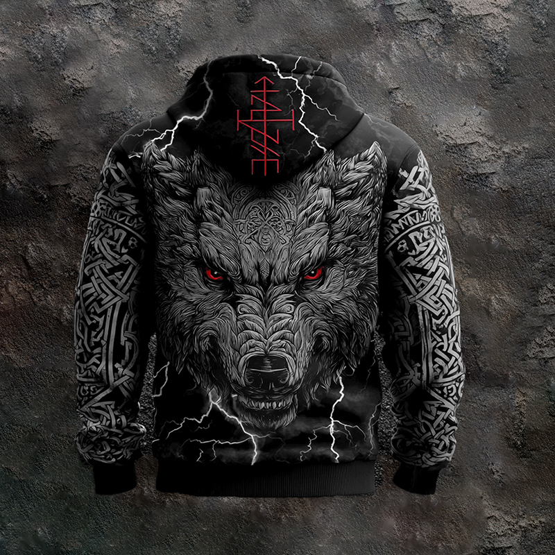 Men's Viking Lightning Wolf Runes Vegvisir Vintage Full Zip Hoodie